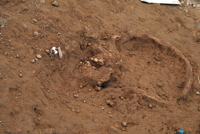 În mormânt, scheletul, din care poate fi văzut craniul cu cele două rânduri de dinţi perfect conservaţi, este pe cale de a fi dezgropat cu minuţiozitate, cu ajutorul unor perii, pense şi al altor instrumente.