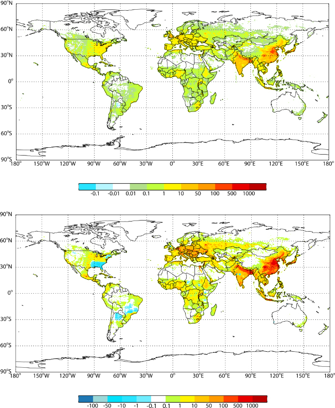 Iată harta deceselor provocate de ozon (harta de sus) şi de particulele fine (harta de jos):