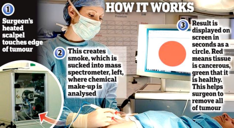 Atunci când taie ţesuturile, bisturiul electric produce fum; dr. Takats a avut ideea ingenioasă de a folosi acest fum, deoarece el conţine informaţii depre tipul de ţesut care s-a carbonizat la atingerea cu bistuiriul electric. În loc de a fi eliminat de ventilatoare, fumul este colectat şi analizat de cu ajutorul spectrometrului; comparând compoziţia sa cu cea a unor tumori canceroase, cunoscute ca atare (informaţie stocată în memoria aparatului), spectrometrul poate „spune” dacă ţesutul este sau nu canceros, iar rezultatele apar pe un ecran amplasat în sala de operaţii.