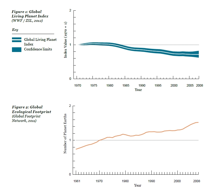 Epuizarea stocurilor şi acumularea de deşeuri şi emisii, în special cele de dioxid de carbon, pot continua pe o durată limitată până când ecosistemele încep să se degradeze şi, în final, să colapseze. Impactul consumului excesiv se vede deja, în diverse fenomene: lipsa apei, deşertificarea, eroziunea solului, scăderea productivităţii solurilor, defrişările şi fenomenele negative cauzate de dispariţia pădurilor, dispariţia speciilor, colapsul unor stocuri de peşte şi schimbările climatice.