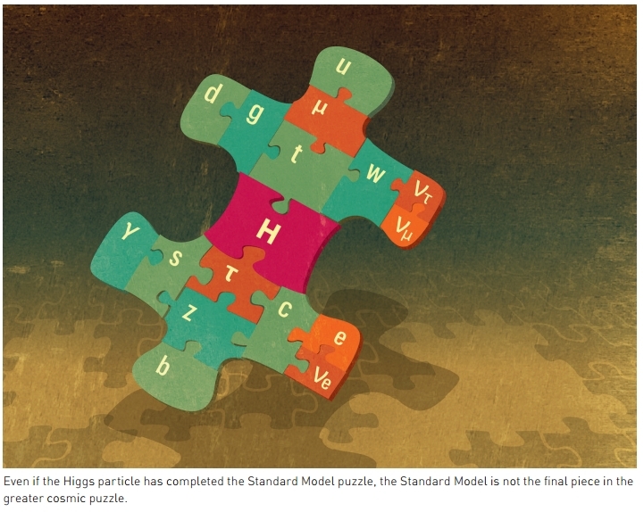Potrivit Modelului Standard, orice lucru din Univers – de la flori şi oameni şi până la planete şi stele – sunt alcătuite doar din câteva elemente de bază: particule de materie. Aceste particule sunt guvernate de forţe care se asigură că totul funcţionează aşa cum trebuie. Întregul Model Standard se bazează, totodată, pe existenţa unui tip special de particule: particula sau bosonul lui Higgs. Această particulă îşi are originea în câmpul invizibil care umple tot spaţiul. Chiar şi atunci când Universul pare să fie vid, acel câmp este acolo. Fără el, nu am exista, pentru că din contactul cu acest câmp particulele îşi dobândesc masa. Teoria propusă de François Englert şi Peter W. Higgs a descris acest proces.