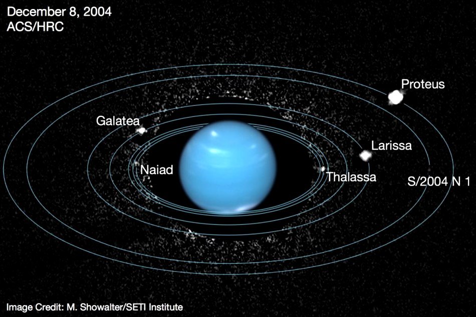 Imaginile luate de Hubble i-au ajutat pe savanţi să descopere încă o mică lună care orbitează în jurul lui Neptun; denumită S/2004 N 1, are numai 20 km diametru, dar este mai uşor de observat deoarece orbitează mai departe de planetă. Datorită dimensiunilor sale mici, S/2004 N 1 a trecut neobservată în 1989, când Voyager 2 a cercetat planeta Neptun; totuşi, sonda a descoperit atunci 6 noi sateliţi naturali anterior necunoscuţi.