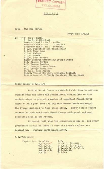 În telegramă, clasată cu menţiunea „secret”, după care The Times a publicat o copie, Winston Churchill justifica atacul. „Pe 3 iulie, dimineaţa, forţele navale britanice au luat poziţie în afara Oranului (lângă portul Mers-el-Kébir) şi au cerut autorităţilor navale franceze să adopte anumite măsuri pentru a evita ca un număr important de unităţi navale franceze intacte, care se aflau în acest port, să cadă pe mâna germanilor”.