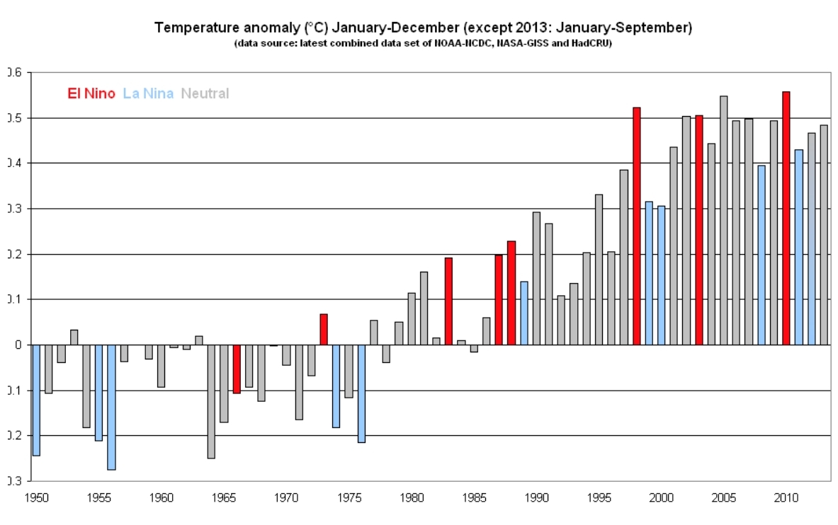 Perioada ianuarie-septembrie 2013 a fost mai caldă decât cea corespondentă din 2011 şi 2012, când fenomenul climatic La Nina a provocat o răcire.