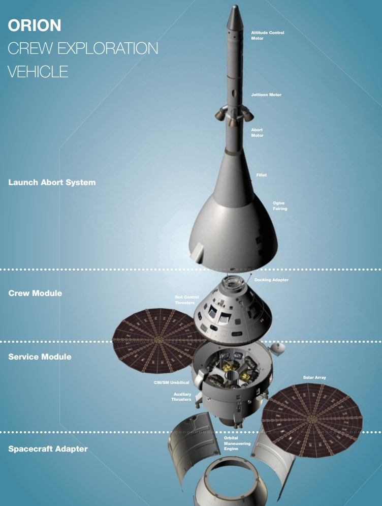 Orion, care va putea să transporte în spaţiu până la şase astronauţi, va fi lansat de SLS, pentru prima misiune spaţială în 2017 în jurul Lunii. Capsula fără astronauţi va fi plasată pe o orbită aflată la 75.000 de kilometri deasupra suprafeţei lunare, pentru un zbor de 21 de zile, destinat mai ales pentru a testa modul în care funcţionează acel lansator greu, de 70 de tone, pentru misiuni cu echipaj uman dincolo de orbita terestră.
