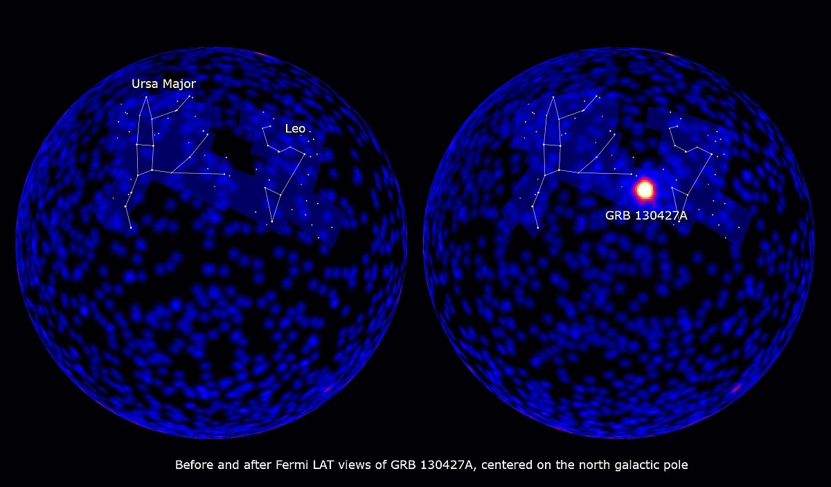 Această explozie a fost atât de luminoasă, încât telescoapele de pe Terra au văzut o iluminare bruscă în constelaţia Leu.