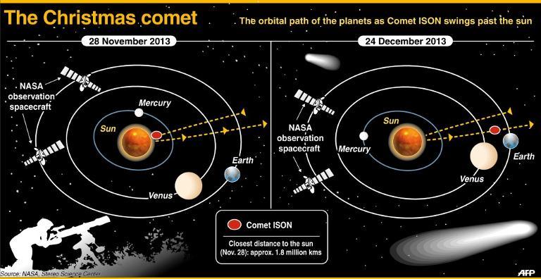 Dacă ISON va supravieţui apropierii ei de Soare, cometa va fi vizibilă pe timpul nopţii din decembrie până în februarie şi va trece cel mai aproape de Terra pe 26 decembrie, la o distanţă de circa 64 milioane de kilometri.