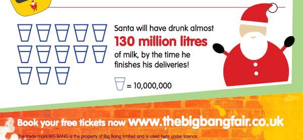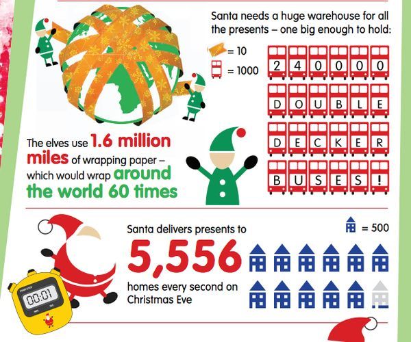 Dacă Moş Crăciun ar trebui să păstreze toate cadourile într-un depozit, presupunând că fiecare cadou ocupă o suprafaţă medie de 0,008 metri cubi, depozitul ar ocupa un spaţiu echivalent cu suprafaţa ocupată de 240.000 de autobuze.