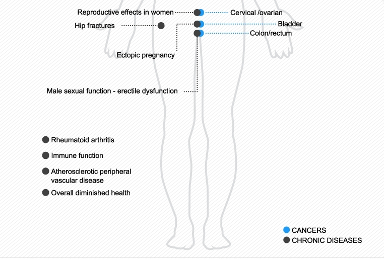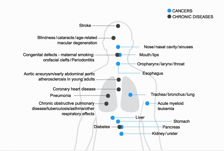 „Acest nou raport arată faptul că fumatul provoacă, de asemenea, degenerescenţa maculară asociată cu vârsta, diabet, cancer de ficat, complicaţii în cazul persoanelor bolnave de cancer şi a celor care s-au vindecat, precum şi tuberculoză, disfuncţii erectile, buză-de-iepure la nou-născuţi, sarcini extrauterine, artrită, inflamaţii şi dereglări ale sistemului imunitar, a precizat Boris Lushniak.
