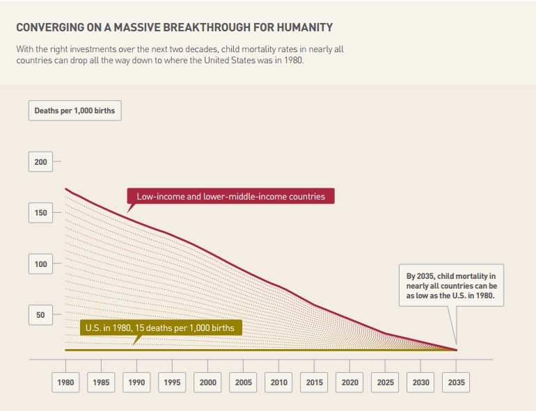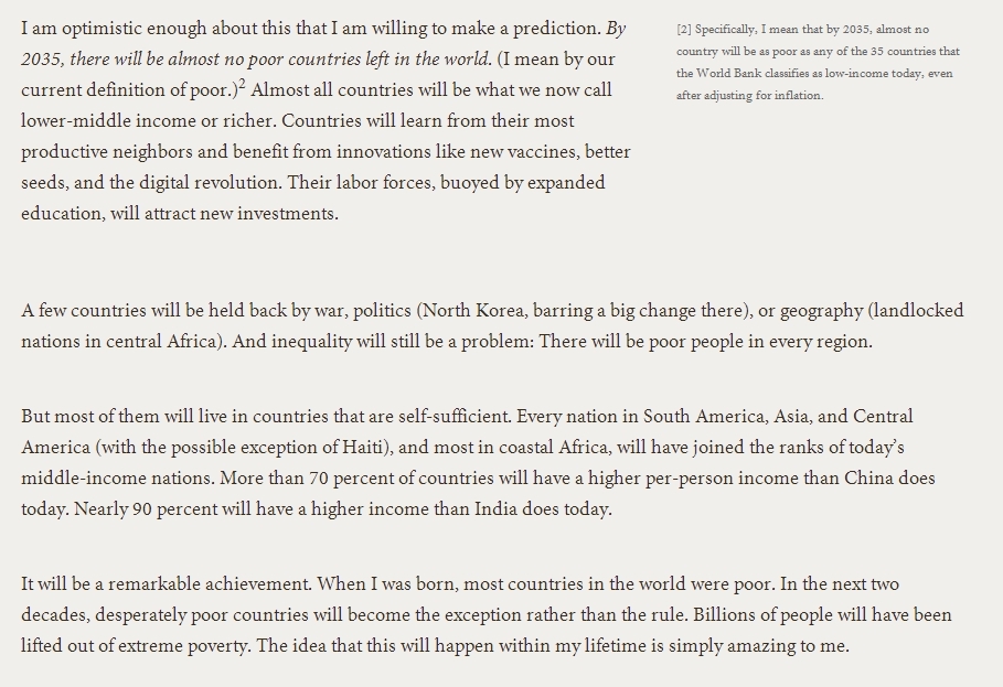 Aproape toate ţările vor avea venituri aproape medii sau mai mari, după criteriile actuale, până în 2035, consideră Gates, potrivit căruia acestea vor învăţa de la vecinii mai performanţi şi vor beneficia de inovaţii precum noi vaccinuri, seminţe mai bune şi revoluţia digitală.