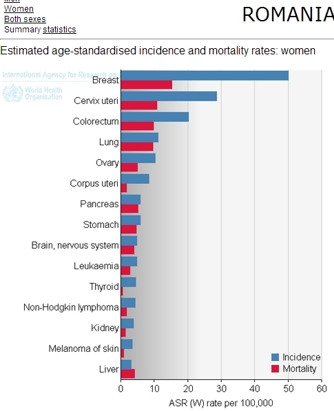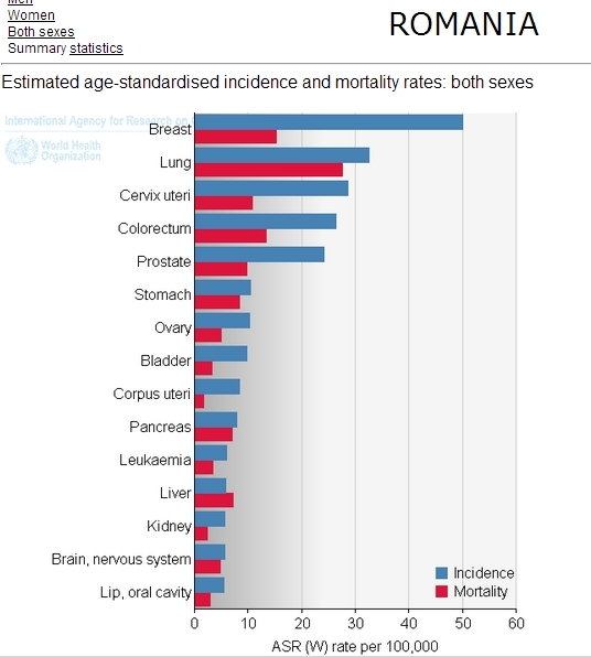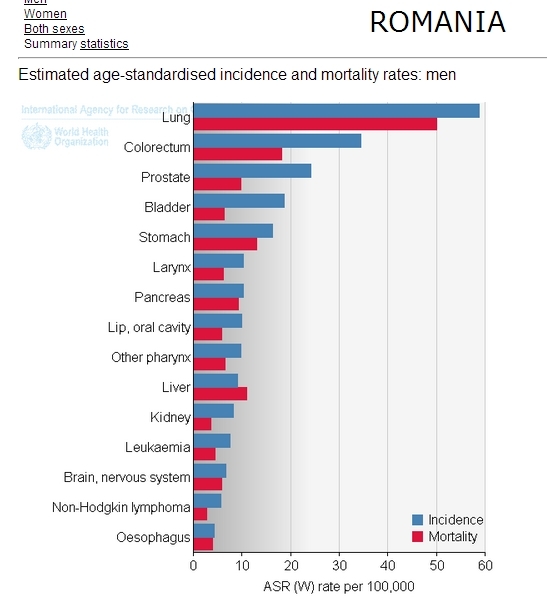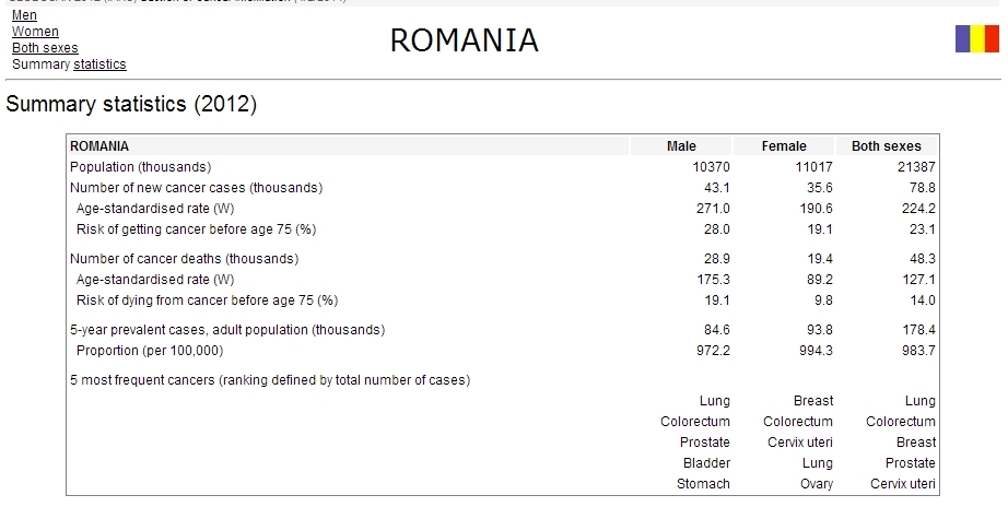 Conform aceluiaşi raport, în România, riscul de a face cancer înaintea vârstei de 75 de ani este de 23 la sută în totalul populaţiei, respectiv de 28 la sută la bărbaţi şi de 19,1 la sută în rândul femeilor.
