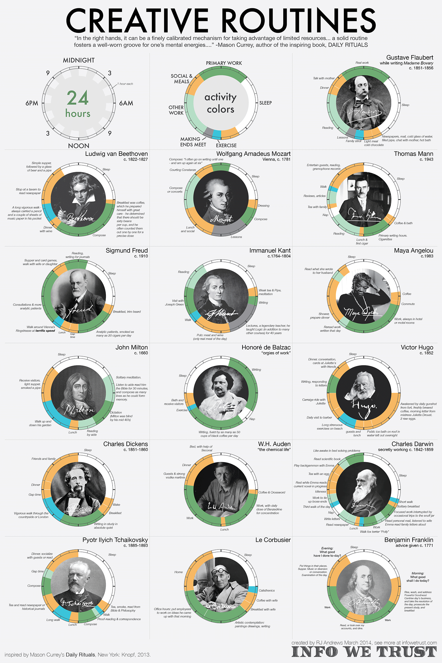 În introducerea cărţii sale, Mason Currey îl citează pe scriitorul V.S. Pritchett: „Mai devreme sau mai târziu, toţi oamenii mari sfârşesc prin a se asemăna. Nu încetează niciodată să muncească. Nu pierd niciun minut. E de-a dreptul deprimant”.