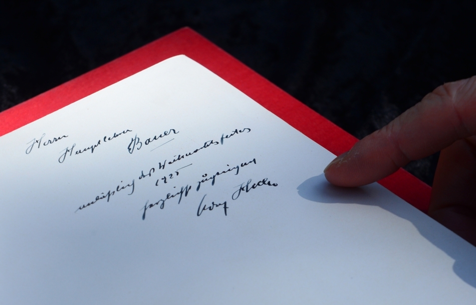 În acea dedicaţie, scrisă între 1925 şi 1926, Hitler îi transmitea urarea „Crăciun fericit!” lui Josef Bauer, unul dintre participanţii la puciul eşuat de la Munchen din 1923, care i-a adus lui Hitler mai multe luni de închisoare, în timpul cărora a scris „Mein Kampf”, în 1924.