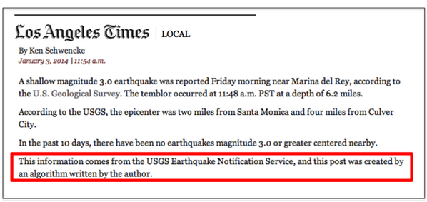 Jurnalistul şi programatorul Ken Schwencke a creat un algoritm care generează în mod automat un articol scurt atunci când se produce un seism.