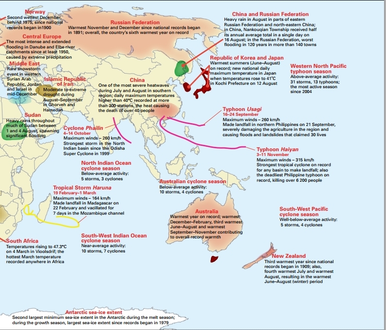 „Numărul fenomenelor extreme produse în 2013 corespunde cu faptele la care ne aşteptam în acest context al încălzirii globale antropice. Am asistat la precipitaţii mai abundente, la valuri de căldură mai intense şi la o agravare a pagubelor cauzate de furtunile şi inundaţiile de coastă provocate de creşterea nivelului mării. Taifunul Haiyan care s-a dezlănţuit asupra Philipinelor reprezintă o ilustrare tragică a acestui fapt”, a declarat Secretarul general al OMM, Michel Jarraud.