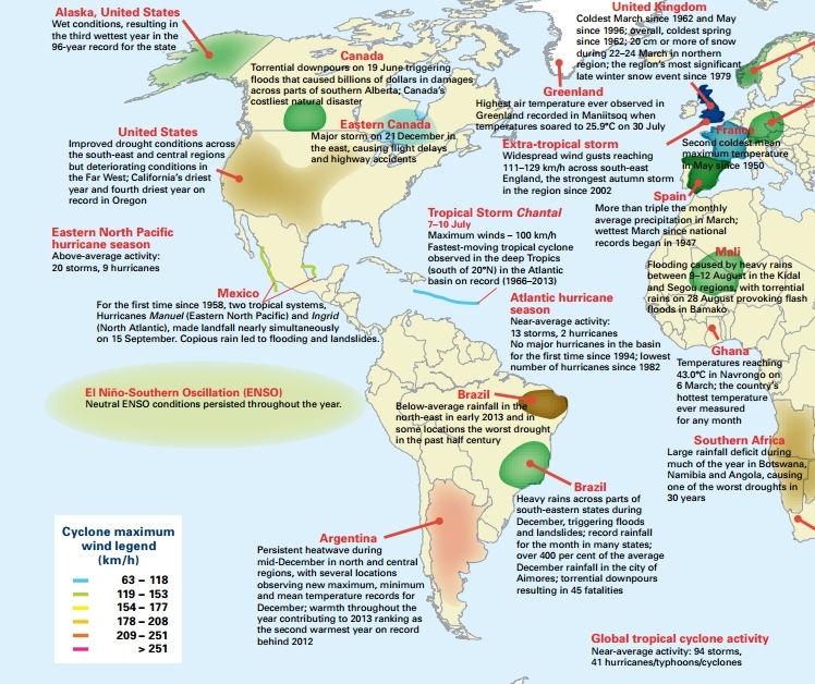 OMM, o agenţie a ONU cu sediul la Geneva, a subliniat „impactul considerabil al secetelor, al valurilor de căldură, al inundaţiilor şi al cicloanelor tropicale” şi notează că 2013 „s-a clasat pe locul al şaselea, la egalitate cu 2007, în analele celor mai calzi ani înregistraţi vreodată, confirmând tendinţa de încălzire observată pe termen lung”.