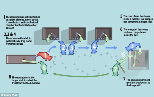 Un experiment similar recent, al biologului Alex Taylor, a demonstrat că o cioară poate rezolva în doar 2 minute şi jumătate o problemă care presupunea îndeplinirea a 8 paşi.