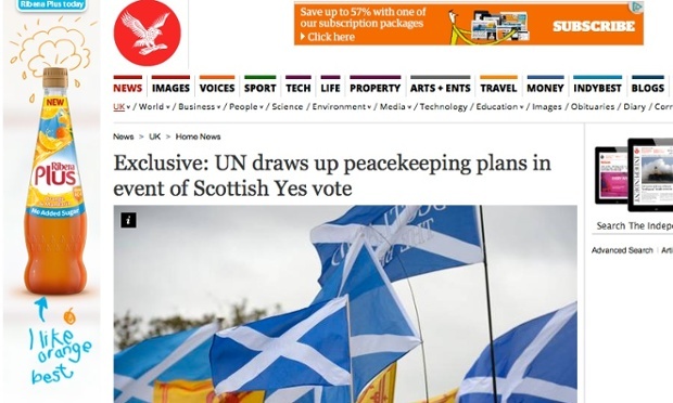 „Naţiunile Unite pregătesc o misiune de menţinere a păcii la graniţele Scoţiei în ipoteza în care «da»-ul va ieşi învingător la referendumul pentru independenţa ţării, în septembrie”, afirmă The Independent.