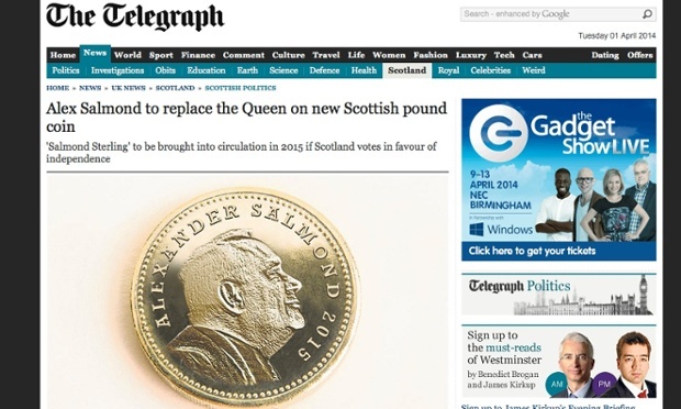 Daily Telegraph şi-a imaginat la rândul său viitoarea monedă de 1 liră sterlină în cazul în care adepţii independenţei Scoţiei vor ieşi învingători la acel referendum. Într-o fotografie publicată în acest cotidian, profilul premierul scoţian Alex Salmond l-a înlocuit pe acela al reginei Elizabeth a II-a.