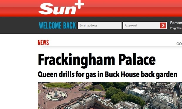 Tabloidul The Sun a publicat sub titlul „Frackingham Palace” un articol în care afirmă că regina Elizabeth a II-a şi-a dat acordul pentru exploatarea gazelor de şist în grădinile Palatului Buckingham, citând o militantă ecologistă care îşi spune „Avril Fuel”.