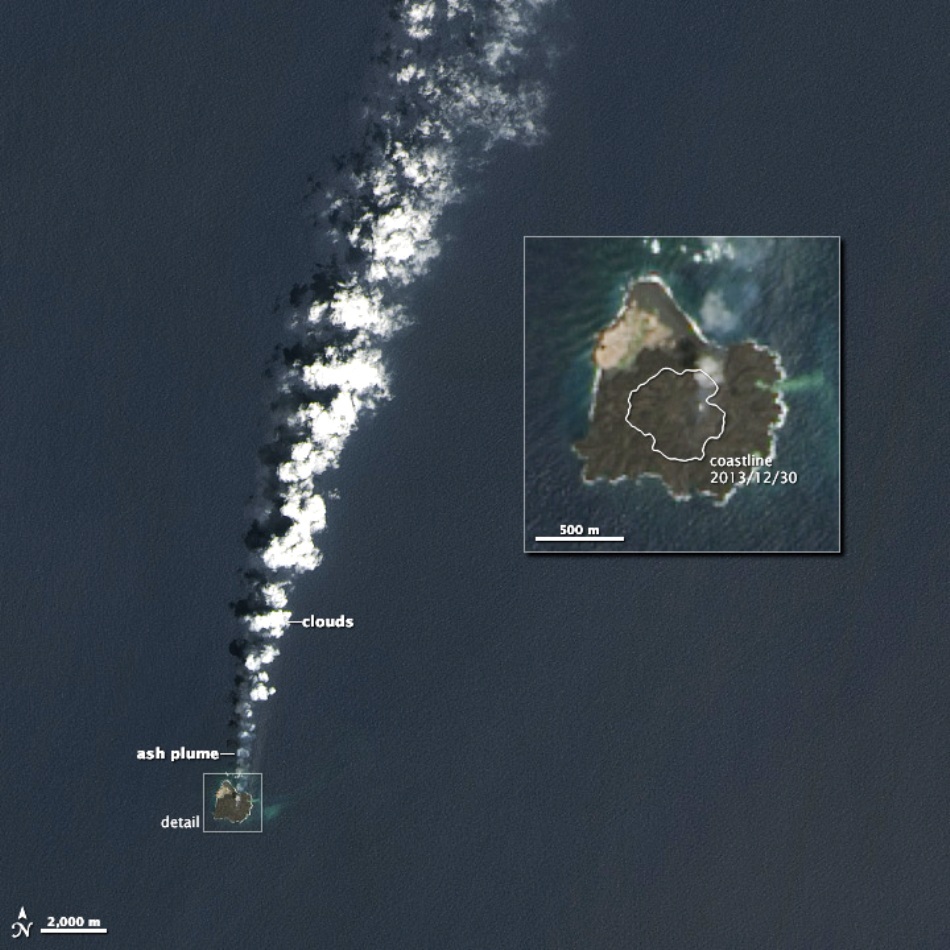 Masa de uscat astfel formată măsoară acum cca. 1 km în diametru şi, din luna decembrie 2013 şi până acum, şi-a triplat înălţimea, ridicându-se acum cu 60 de metri deasupra nivelului mării.