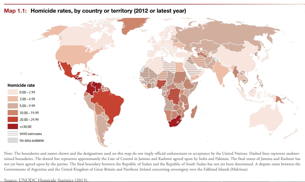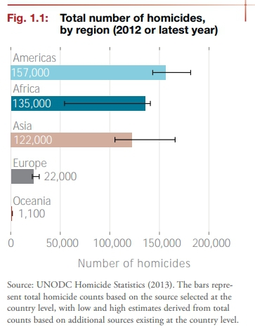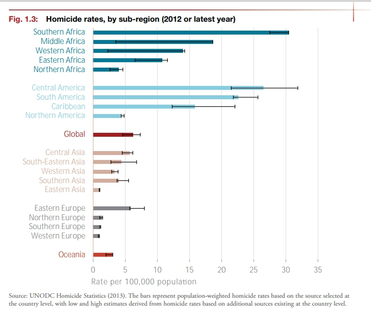 Rata criminalităţii este mai mare în Africa de Sud (30 de crime la 100.000 locuitori) şi în America Centrală (26 de victime la 100.000 de locuitori).