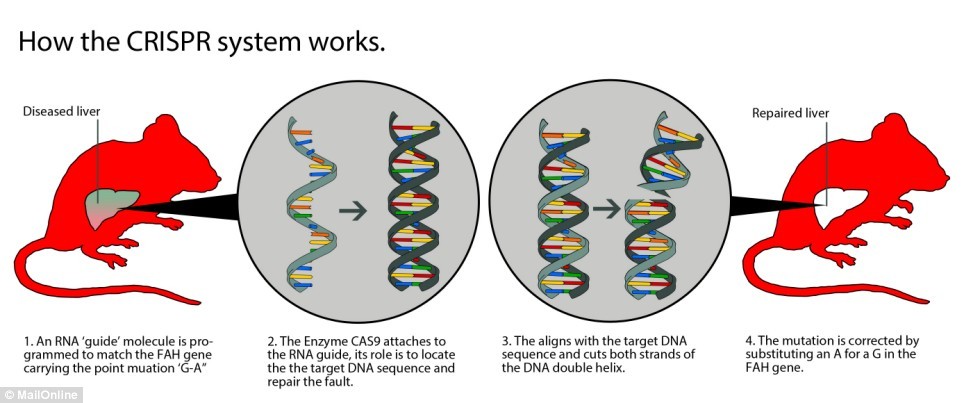 Liniile de ARN au acţionat ca nişte molecule-ghid pentru a găsi perechea de ADN mutantă, denumită FAH. Enzima Cas9, ataşată de liniile de ARN, a putut apoi să repare acele gene mutante.