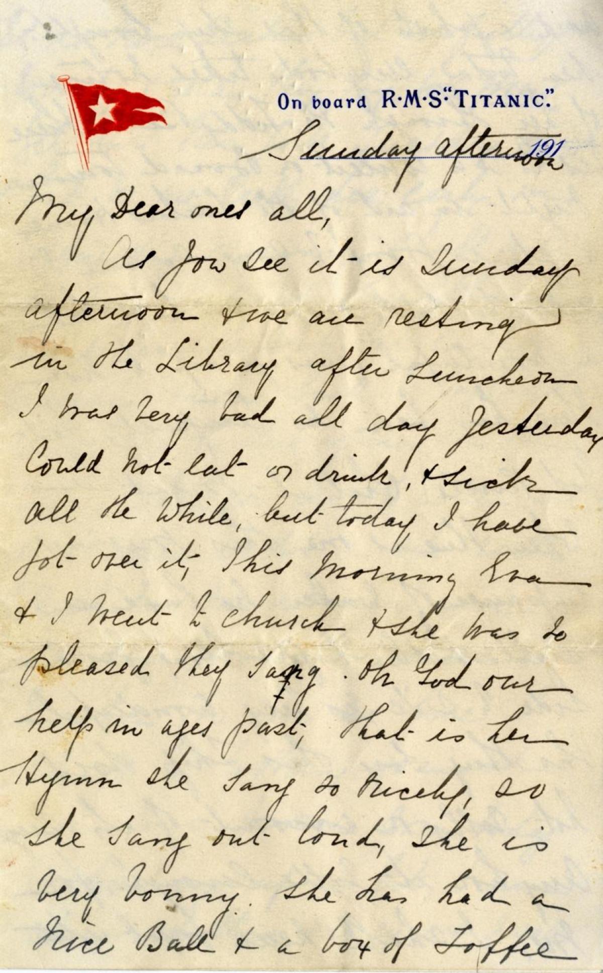 Redactată de Esther Hart, o supravieţuitoare de pe Titanic, scrisoarea nu a fost expediată niciodată. Esther trebuia să o expedieze mamei sale, după revenirea pachebotului la Southampton, în sudul Angliei, în aprilie 1912.