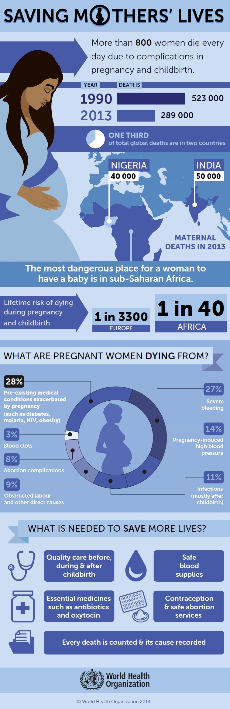 Acesta arată că 289.000 de femei au murit în 2013 din cauza complicaţiilor la sarcină şi naştere, cu 45 la sută mai puţine decât în 1990, când se înregistrau 523.000 astfel de decese. În 2013, au fost 210 decese materne la 100.000 de copii născuţi, în timp ce în urmă cu 25 de ani se înregistrau 380 de decese materne la suta de mii de naşteri.