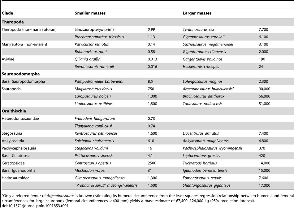 Studiul a estimat greutatea fiecărei specii de dinozaur ale cărei fosile conţin oasele necesare pentru formula de calcul utilizată în această analiză, ce are la bază relaţia dintre robusteţea oaselor picioarelor şi greutatea totală a animalului.