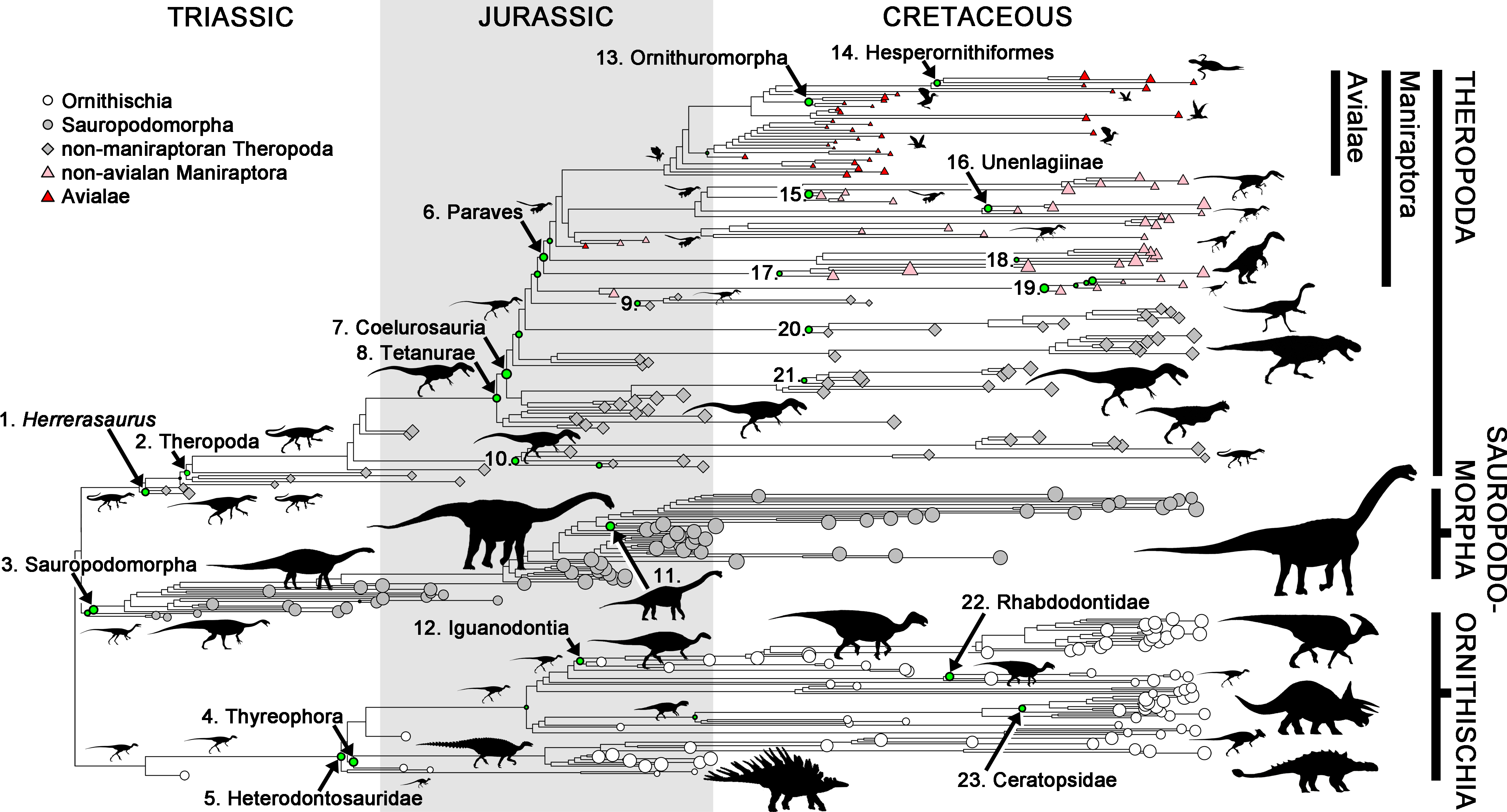 Paleontologul David Evans de la Royal Ontario Museum din Canada consideră că dimensiunile corporale ale dinozaurilor au evoluat foarte repede, la începuturile apariţiei lor pe Terra, întrucât dinozaurii au invadat noi nişe ecologice, însă, apoi, această evoluţie a încetat în rândul celor mai multe specii. Excepţia a fost grupul „maniraptora” din care au apărut păsările.
