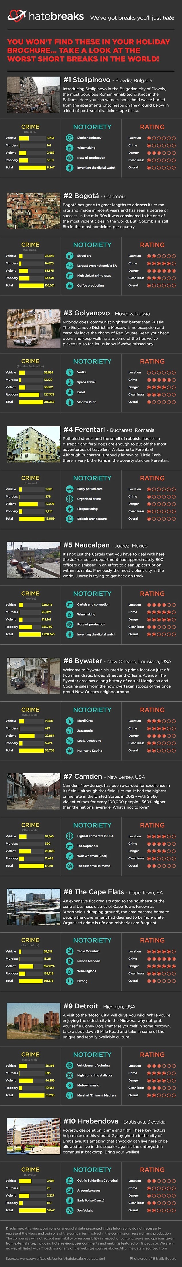 Ţinând cont de mai mulţi factori monitorizaţi în ultimele 18 luni, precum rata criminalităţii, eficienţa autorităţilor locale şi statisticile referitoare la gradul de curăţenie din zonă, site-ul buyagift.com a alcătuit Topul 10 al celor mai urâte destinaţii de vacanţă pe care turiştii din lumea întreagă trebuie să le evite cu orice preţ.