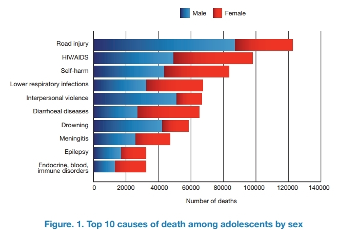 În plus, OMS notează că trei cauze principale de deces ale adolescenţilor pe plan mondial sunt „accidentele de transport, SIDA şi sinuciderile”.