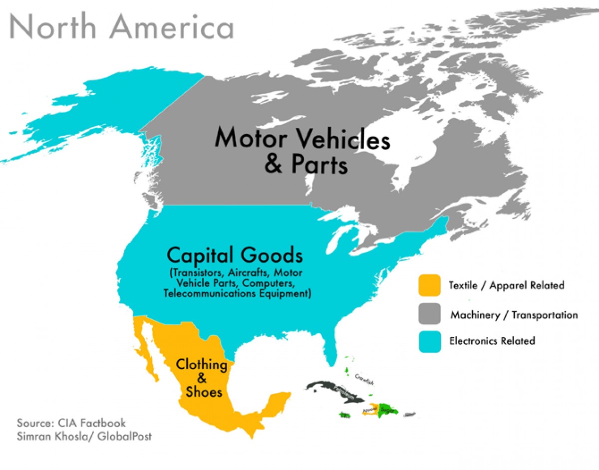 Ţările asiatice exportă în special textile, produse din lemn şi semiconductori, iar Africa este foarte bogată în resurse nanturale. Statele de aici exportă aur, diamante, alte metale preţioase, dar şi petrol.