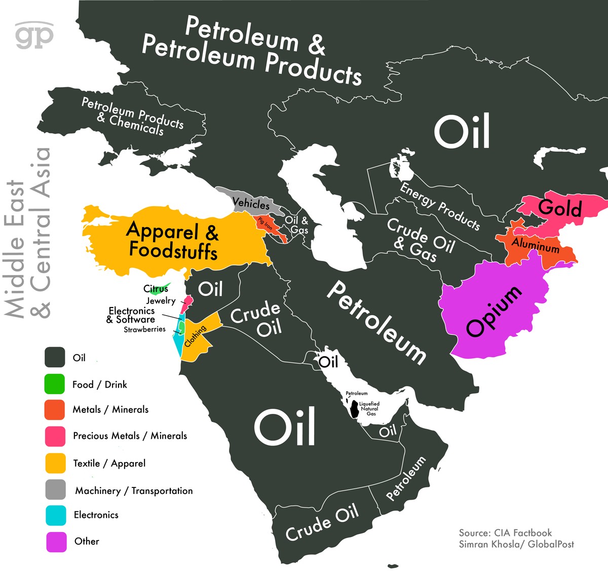 Aşa cum era de aşteptat, statele din Orientul Mijlociu şi Asia Centrală au ca produs de bază petrolul.