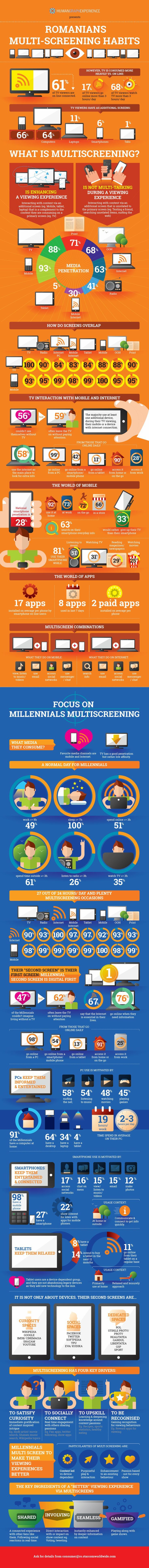 Concluziile infograficului surprind obiceiurile de consum media la nivelul populaţiei generale, urbane şi „al generaţiei Y” (ai cărei membri sunt numiţi şi „millennials”). Punctul central în jurul căruia este construită informaţia este activitatea de multi-screening (folosirea mai multor ecrane) şi modul în care se regăseşte această activitate în consumul de media de zi cu zi.