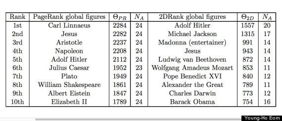Pentru algoritmul PageRank, acelaşi care este folosit şi de motorul de căutare Google, primul loc a fost ocupat de Carl Linné. Topul 10 este completat de Iisus, Aristotel, Napoleon, Adolf Hitler, Iulius Cezar, Platon, William Shakespeare, Albert Einstein şi regina Elizabeth a II-a.