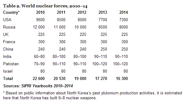 La începutul lui 2014, China deţinea 250 de focoase nucleare, India între 90 şi 110, Pakistanul între 100 şi 120, iar Israelul 80, potrivit raportului.