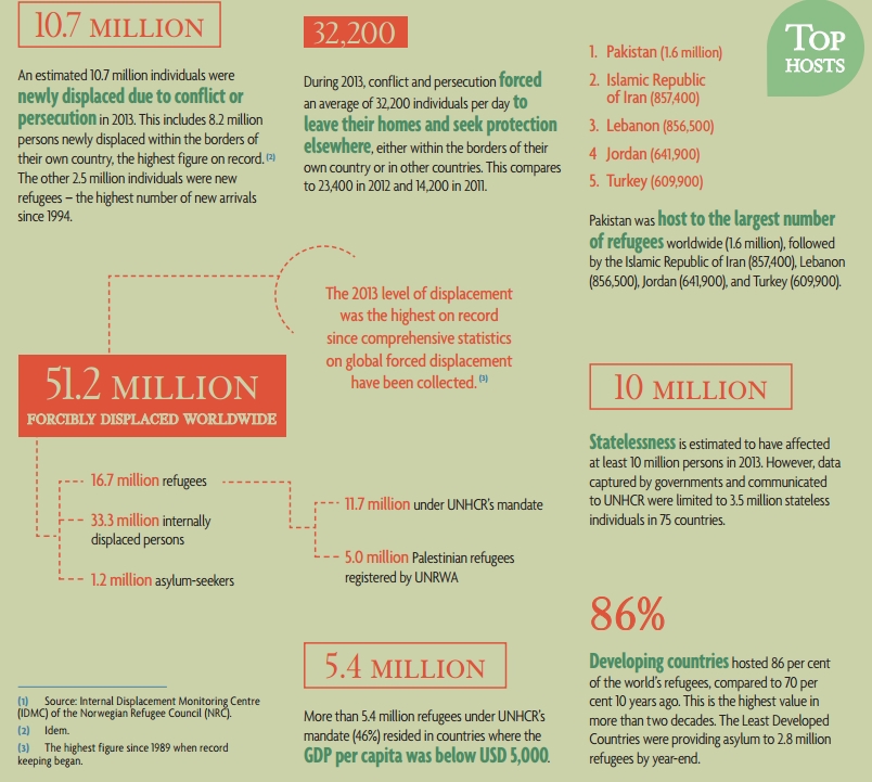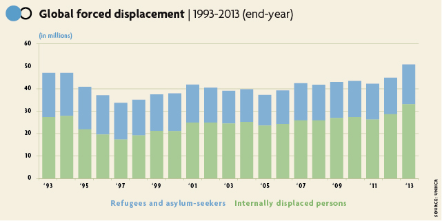 Raportul mai arată că 51,2 milioane de oameni se aflau în situaţie de deplasare forţată la finele anului 2013, cu 6 milioane mai mulţi decât cei 45,2 milioane raportaţi în 2012, fenomenul deplasării forţate la nivel global depăşind cifra de 50 de milioane pentru prima dată de la cel de-al doilea război mondial.