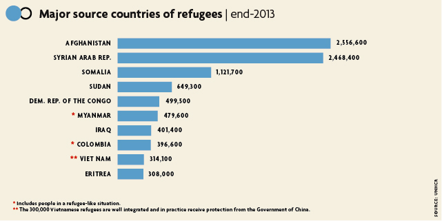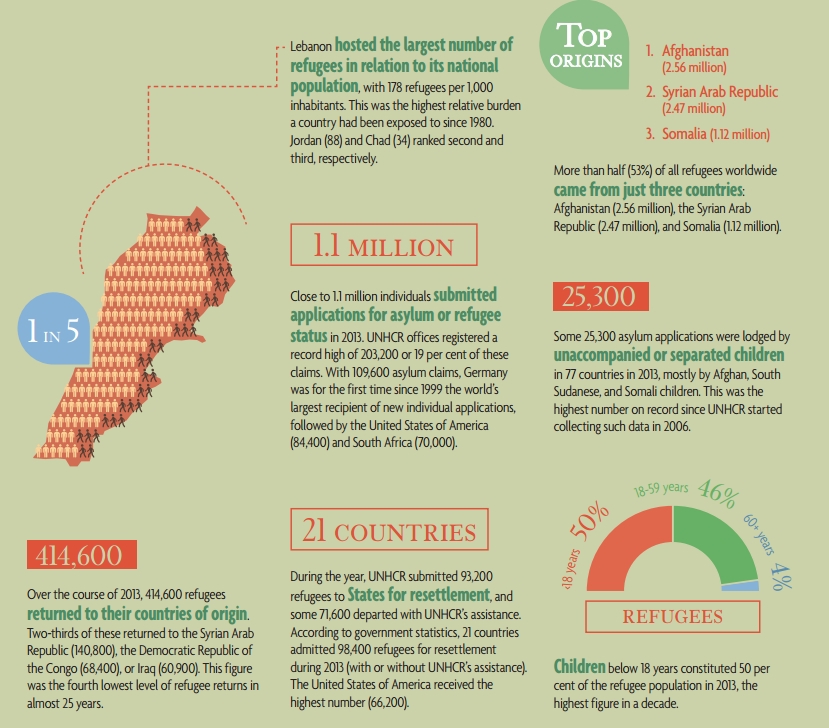 „Aceste cifre totale sunt cele mai ridicate raportate de UNHCR din 2001. În plus, mai bine de jumătate din refugiaţii sub protecţia UNHCR (6,3 milioane) se aflau, la finele anului 2013, în exil de peste cinci ani”, precizează autorii raportului.