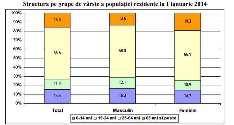 Comparaţiv cu 1 ianuarie 2013, numărul populaţiei a scăzut atât pentru persoanele de sex masculin, cât şi pentru cele de sex feminin, potrivit INS.