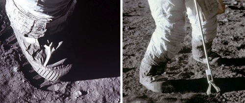 În următoarele şase ore, cei doi au verificat sistemele modulului, au luat masa formată din patru cuburi de şuncă, trei biscuiţi cu zahăr, piersici, suc de ananas şi grepfrut şi cafea şi s-au odihnit. Apoi, la ora 10:39:33 EDT, Neil Armstrong a deschis trapa, a coborât pe scara modulului şi a rostit în cască una dintre cele mai celebre fraze din istorie: „Un pas mic pentru un om, un salt uriaş pentru omenire”.