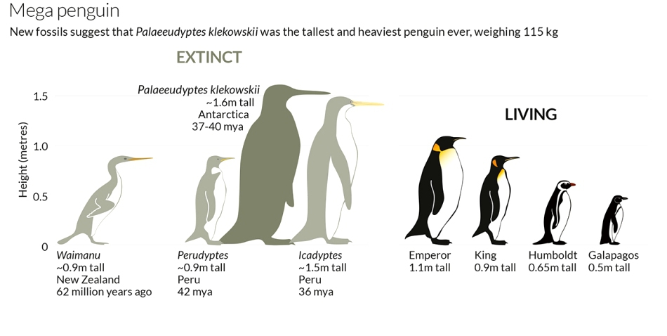 Specia, denumită Palaeeudyptes klekowskii , a trăit acum 37-40 milioane de ani; fosilele au fost descoperite pe Insula Seymour, din largul Peninsulei Antarctice, de către Carolina Acosta Hospitaleche, de la Muzeul La Plata, din Argentina.