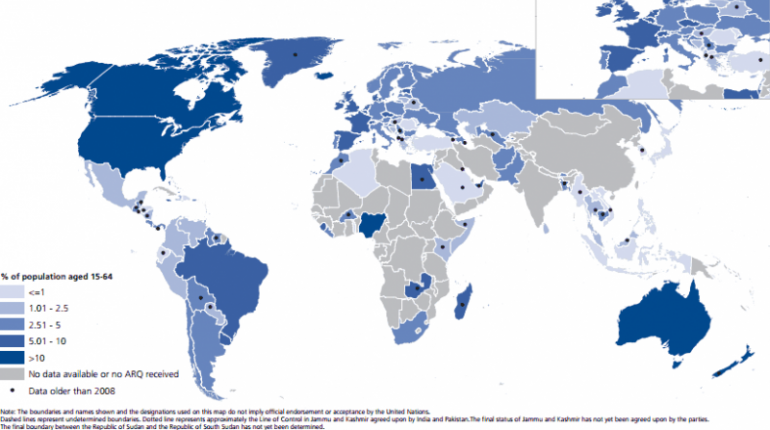 Raportul ONU pe anul 2014 arată o tendinţă de scădere a consumului de cannabis la nivel global, mai ales în centrul şi vestul Europei.