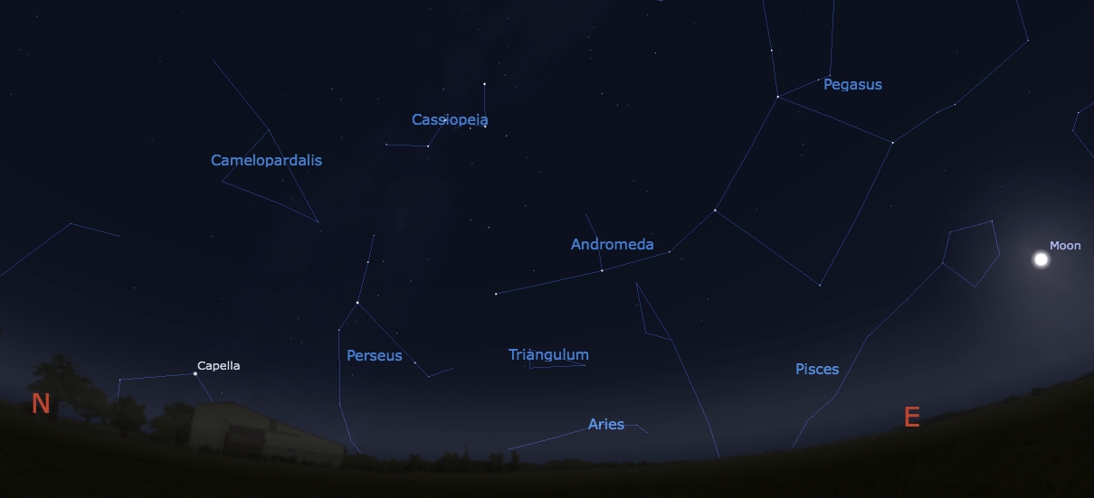 5. Descarcă o hartă a cerului valabilă pentru luna august. Perseidele par să apară dintr-un loc situat între constelaţia Cassiopeia şi Perseu. Aceste constelaţii se vor afla la miezul nopţii spre NE. Pe Cassiopeia o vei recunoaşte uşor deoarece are forma unui “W”. Perseu se află imediat în stânga jos.