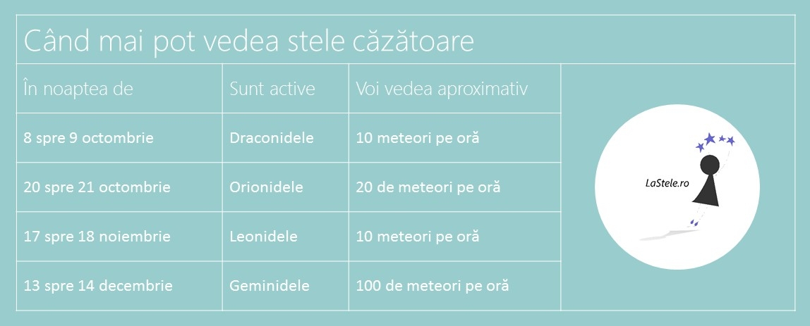 Anul acesta vor mai fi patru curenţi de meteori: Draconidele, Orionidele, Leonidele şi Geminidele, toate însă în sezonul rece când observaţiile în aer liber sunt mai greu de îndurat.