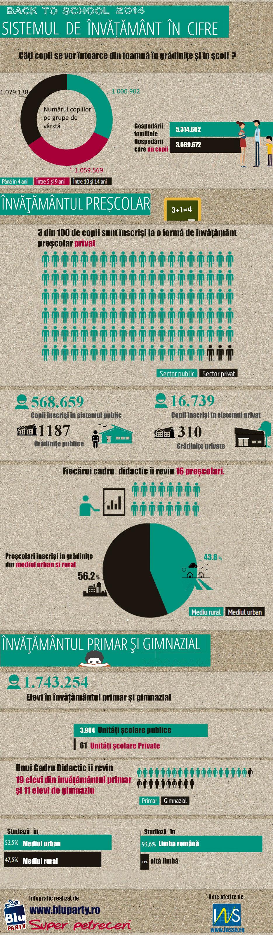 Echipa BluParty a colectat mai multe date interesante despre copiii din România, alcătuind un infografic despre sistemul de învăţământ din România.
