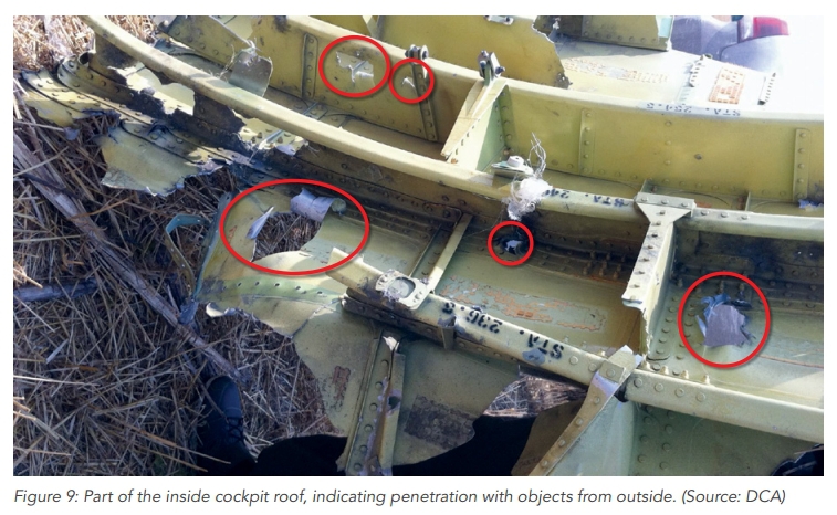 Experţii au precizat că avionul „s-a dezmembrat în aer probabil ca urmare a daunelor structurale cauzate de un număr mare de obiecte cu mare viteză care au străpuns aeronava din exterior”.
