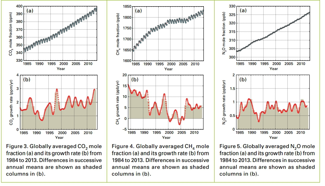 În 2013, concentraţia de CO2 în atmosferă reprezenta 142% faţă de nivelul din epoca preindustrială (1750), cea a metanului 253%, iar a protoxidului de azot 121%.