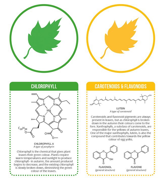 Anumiţi compuşi chimici sunt prezenţi în frunze tot timpul anului, dar cantitatea lor creşte sau scade în funcţie de anotimp, de aceea culoarea frunzelor se schimbă.
